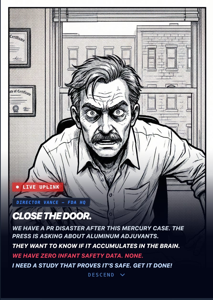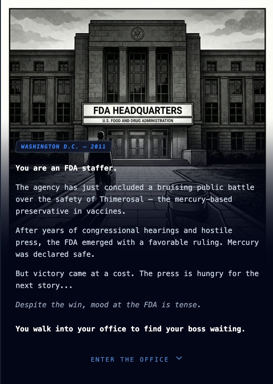 You’re playing the role of an FDA staffer. You’re brought into your boss Vance’s office, and he seems stressed out. He has a job for you... After a bruising brush with the law over the use of mercury, the press and the public are breathing down his neck for information on all the other metals used in vaccines. Vance realises the FDA don’t have much data on the safety of aluminium, and he needs a study, NOW! Your job is to put it together as quickly as Vance demands… Can you get the study together, and keep your morals and ethics too?
